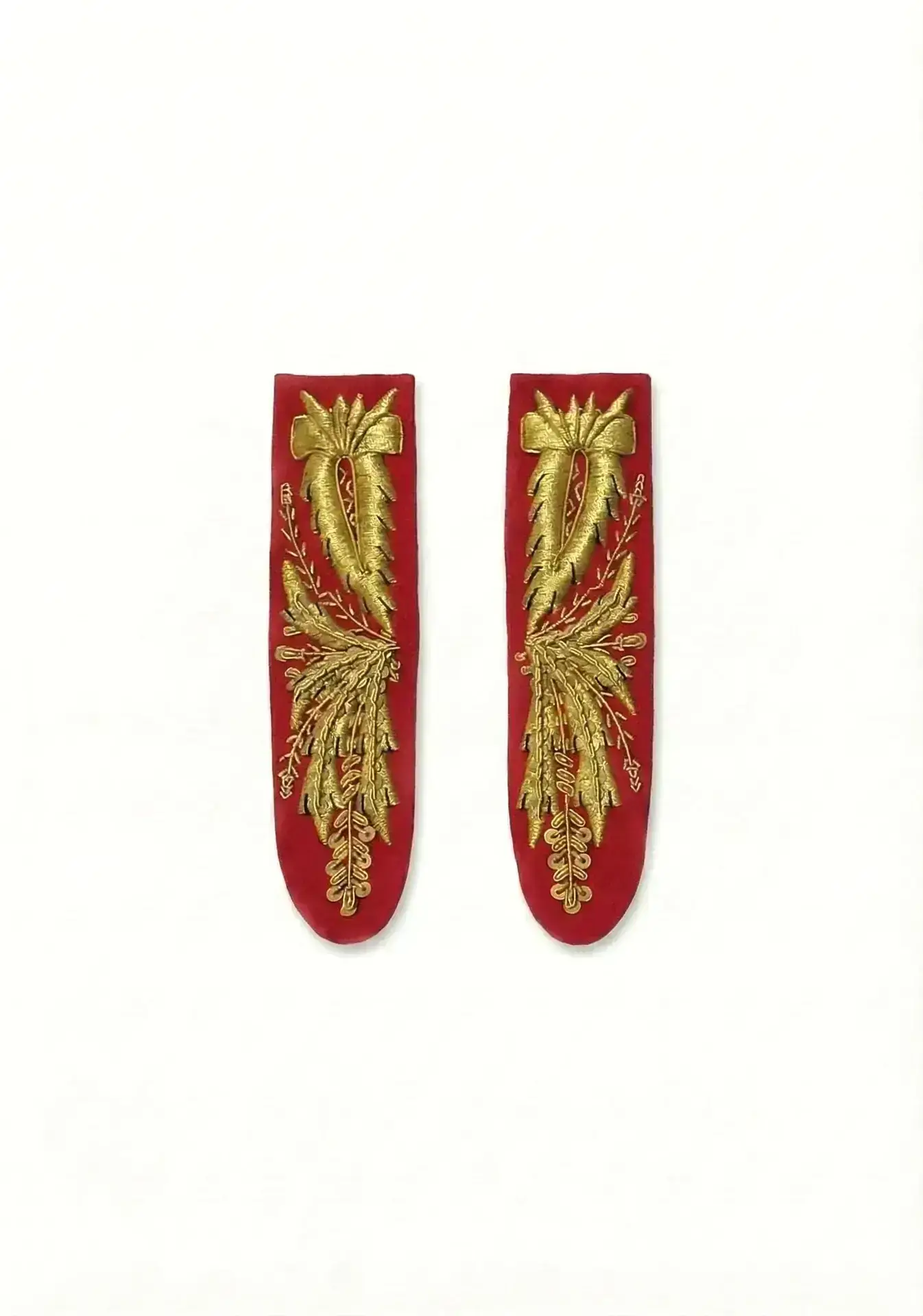 La caratteristica principale di questi alamari è la pregiata lavorazione a mano in canottiglia (filo metallico a spirale). Questa tecnica antica permette di ottenere un ricamo in rilievo, tridimensionale e luminoso, impossibile da replicare con i comuni filati industriali. Ogni dettaglio del “fiorame” – che richiama motivi vegetali di foglia d’acanto o alloro – viene costruito pazientemente, conferendo al manufatto una lucentezza e una solennità uniche.
