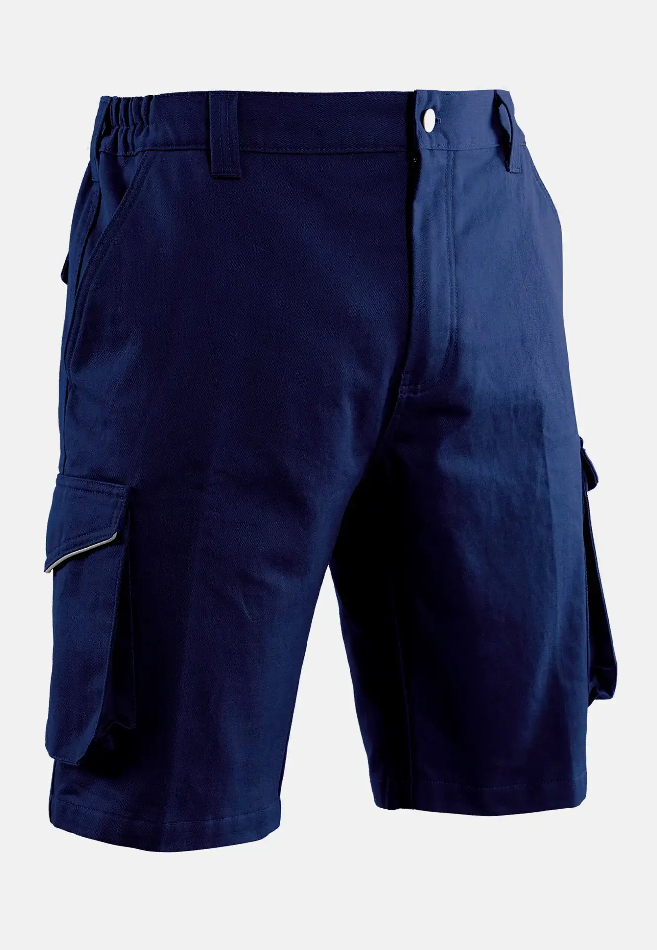 Chiusura patta con zip Due tasche anteriori a filetto Una tasca posteriore applicata chiusa con bottone, due tasconi laterali con piping riflettente Doppie cuciture nei punti di maggior sforzo